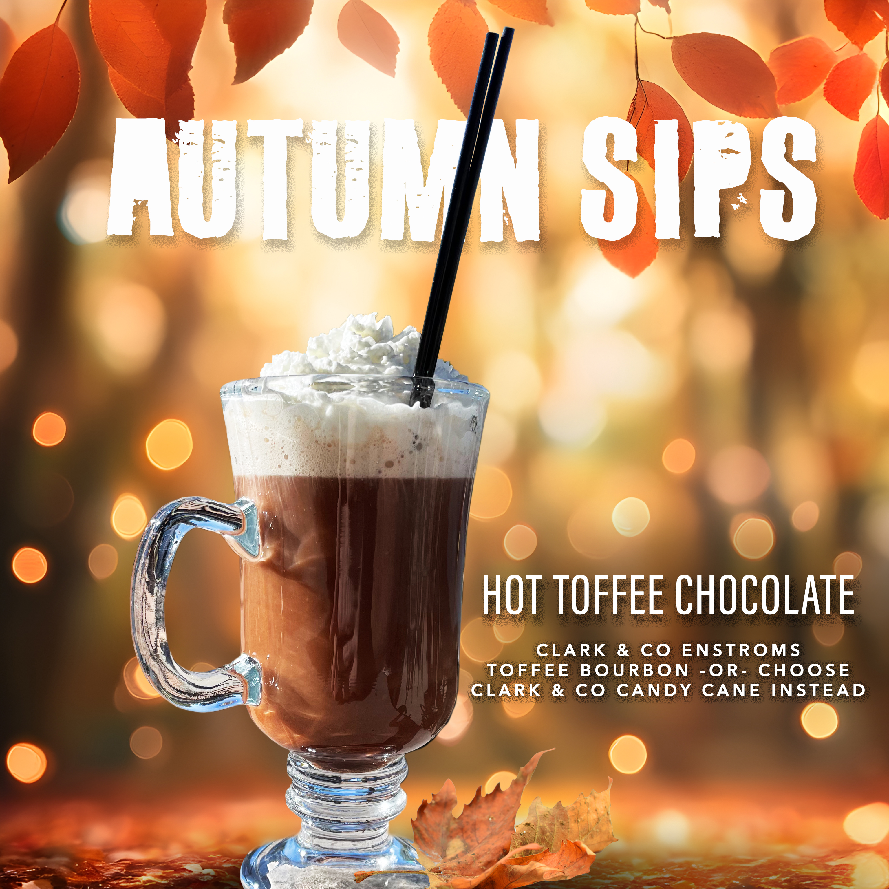 CHOOSE CLARK & CO ENSTROM'S TOFFEE BOURBON OR CLARK & CO CANDY CANE MIXED WITH HOT CHOCOLATE. topped with whip