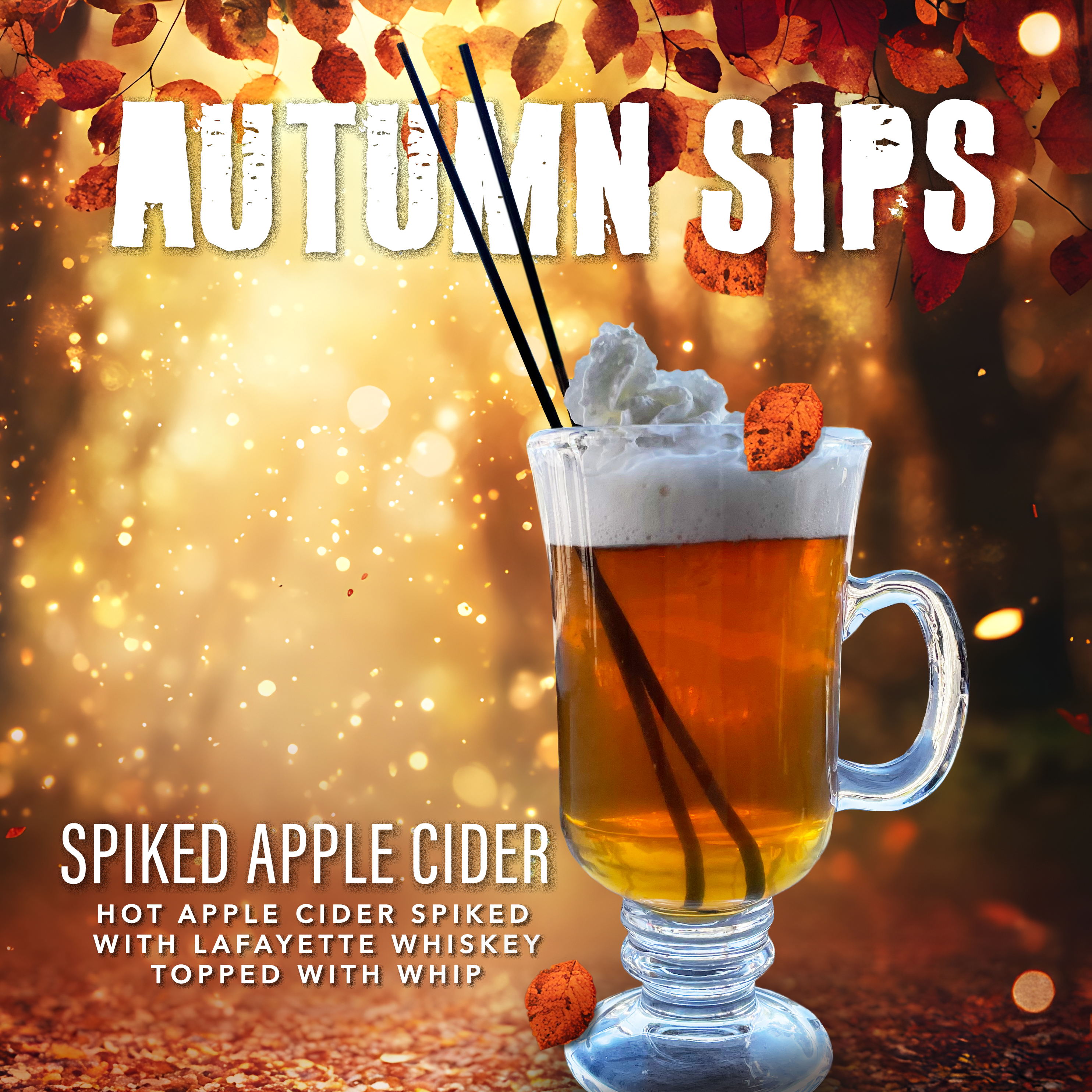 Hot apple cider spiked with lafayette whiskey topped with whip cream